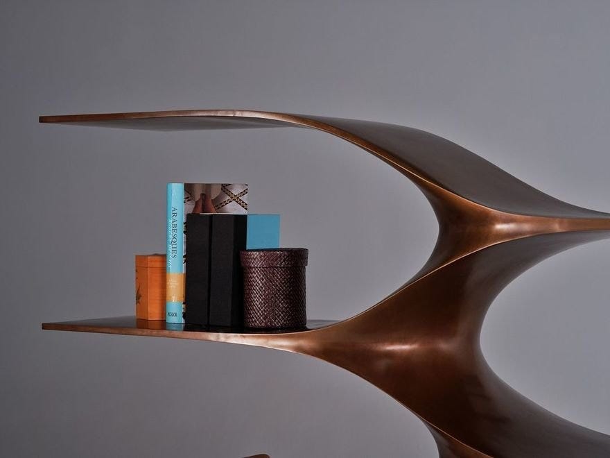 It’s a sculptural shelving centrepiece with a multi-tiered structure. Seamlessly rising from the ground, each ebb and flow is counterbalanced from a central vertebra.