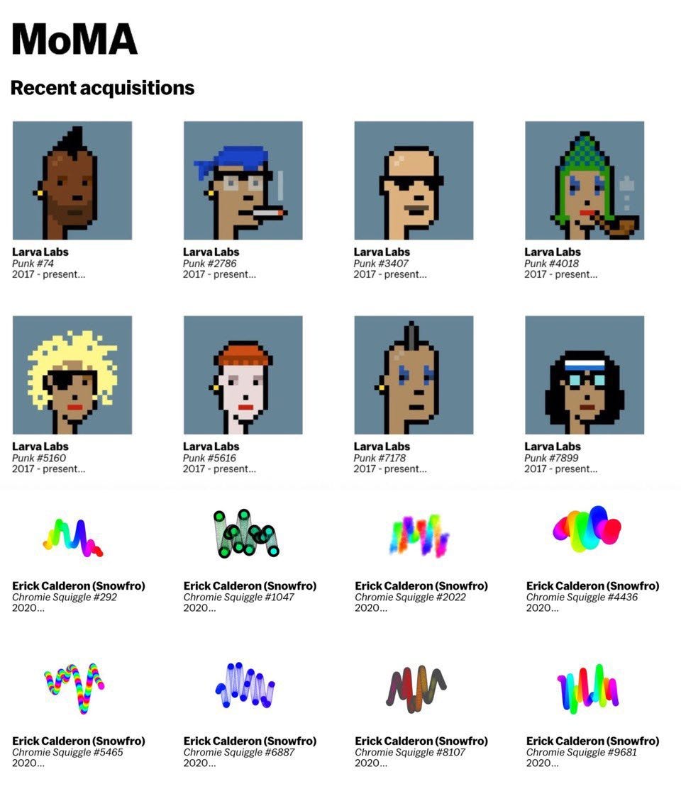 Canon always begins with a human decision and The Museum of Modern Art has added eight CryptoPunks and eight Chromie Squiggles NFTs to its permanent collection, housed in its Media and Performance department.